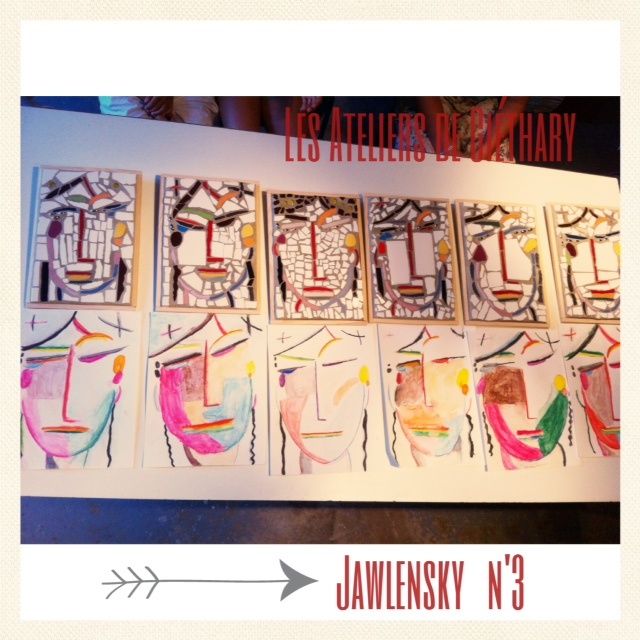 En effet ce peintre russe, qui m'inspire depuis le début de l'été, a une fois de plus beaucoup plus aux p'tits artistes. Cette semaine, stage du 5 au 9 aout, était composée d'autant de filles que de garçons, de 7 à 9 ans, un bon groupe qui a su plonger relativement vite dans la technique de la mosaique....