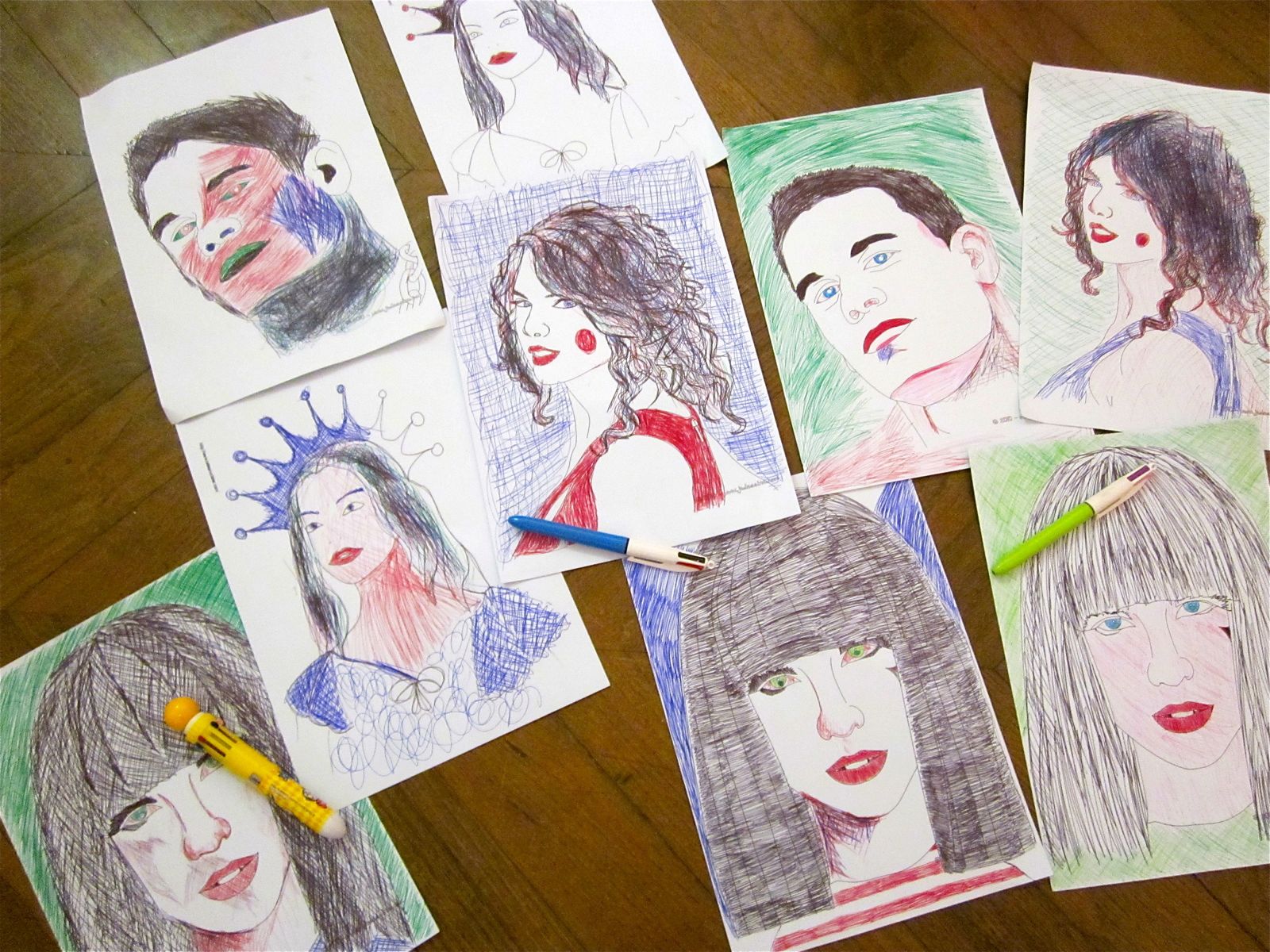 Alors, après la visite, nous nous sommes installés au milieu d'une salle, entourés des grands dessins de l'artiste. Munis de nos bics 4 couleurs ..... c'est parti pour un atelier des plus original ! Le stylo bic c'est chouette, ça glisse sur la feuille, plus on croise les traits et plus c'est foncé....très intéressant comme résultat !