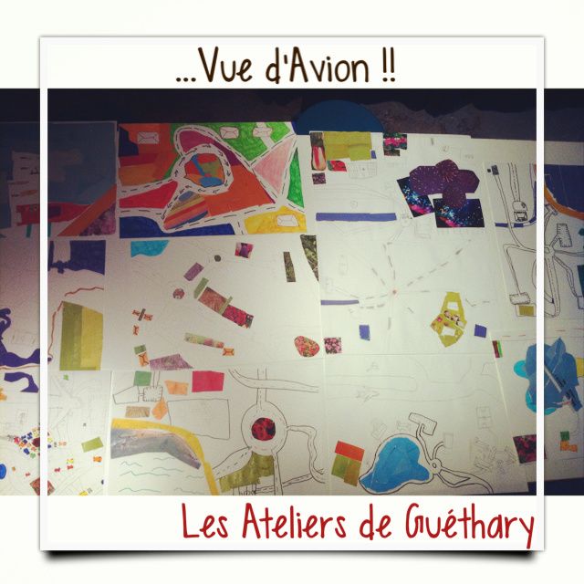 Aux Ateliers de Guéthary, les enfants aiment aussi le collage: choix de magasines (qui peuvent s'avérer très rigolo) ... découpe de papier, des formes qui inspirent, des couleurs qui attirent...et c'est parti pour "Une Vue d'Avion !".